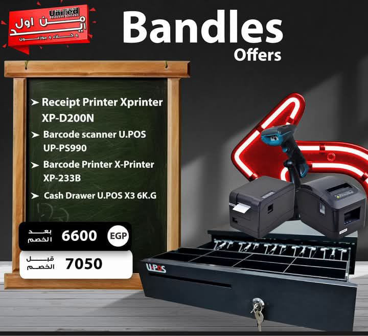 طابعة فواتير حرارية + قاريء أكواد + درج كاشير + طابعة باركود